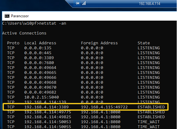 Csoporttársa gépén indítsa el a Távoli asztal kapcsolat programot. Kapcsolódjon a saját virtuális gépéhez és ott indítsa el a parancssor-t. Adja ki a netstat -an parancsot. Keresse meg a listában azt a sort, ami a távoli asztal kapcsolatra vonatkozik. Készítsen képet az ablakról és illessze be ide:_