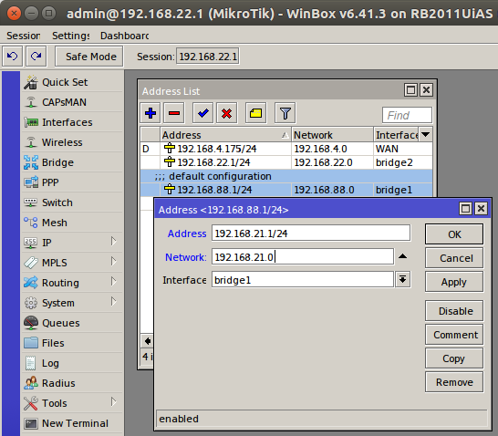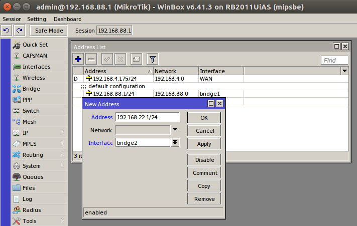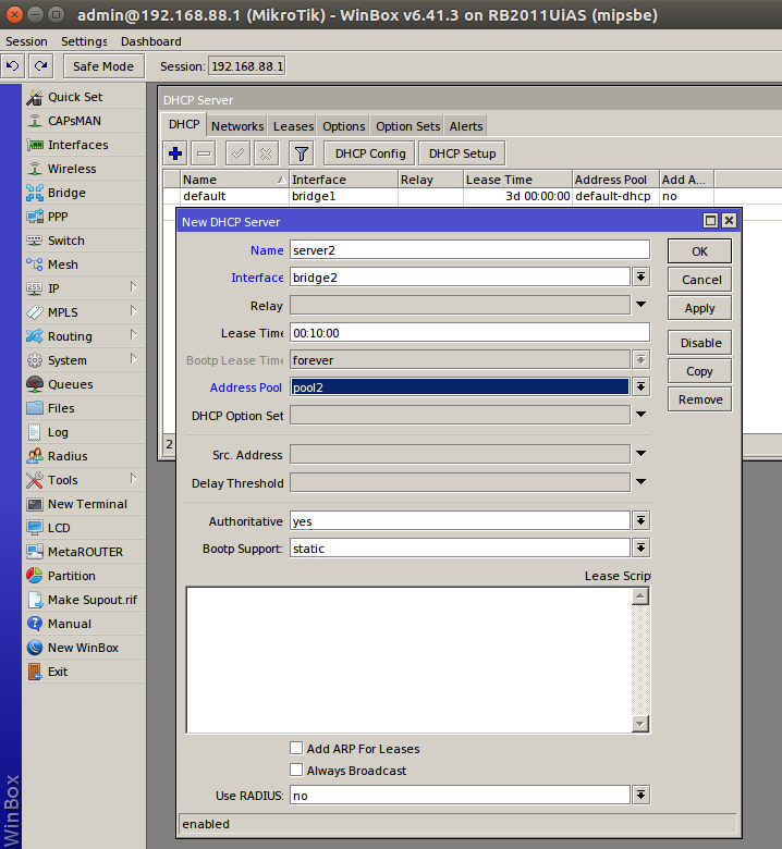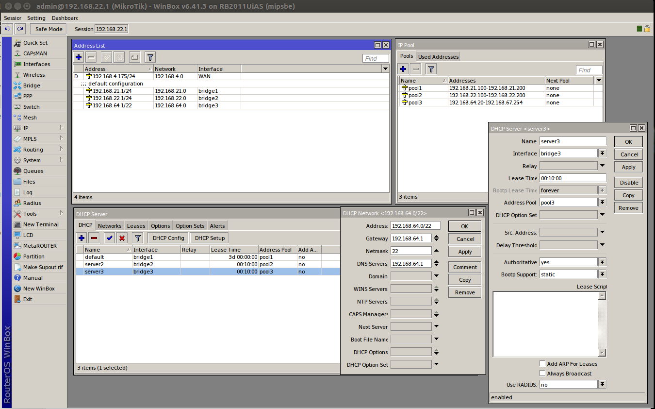Az eddigiekhez hasonlóan hozzuk létre az IP címet a bridge3 hídhoz, a pool3 nevű tartományt, a dhcp hálózatot (DHCP Network) és a server3 nevű DHCP Server-t a bridge3 hídon: