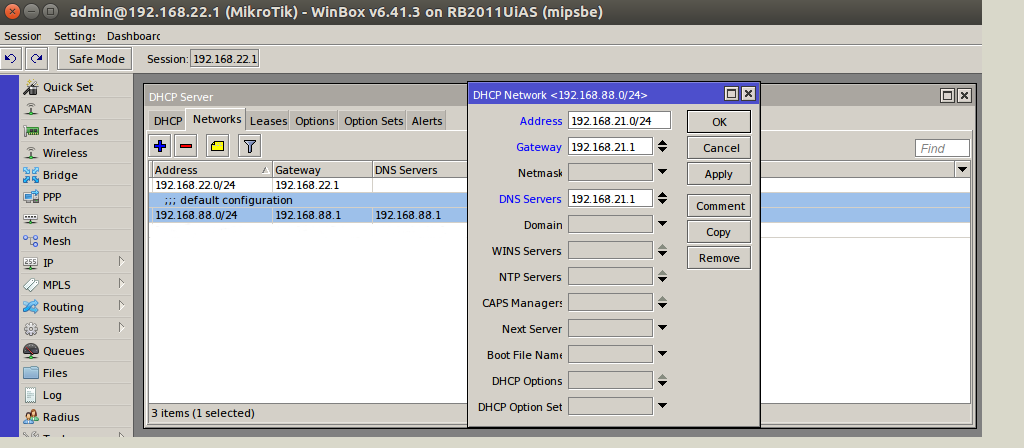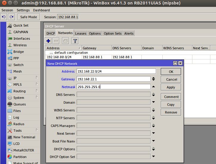 Az IP / DHCP Server ablakban hozzon létre új hálózatot (Networks):