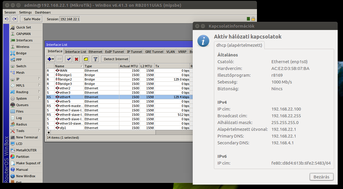 Ezzel a tantermek hálózatát beállítottunk, a router ETH4 és ETH5 portján már működik a DHCP szerver. Csatlakoztassa ide a kliens gépünket, automatikusan a 192.168.22.0/24 tartományból kell IP címet kapnia. A kapott IP címet írja ide: _.