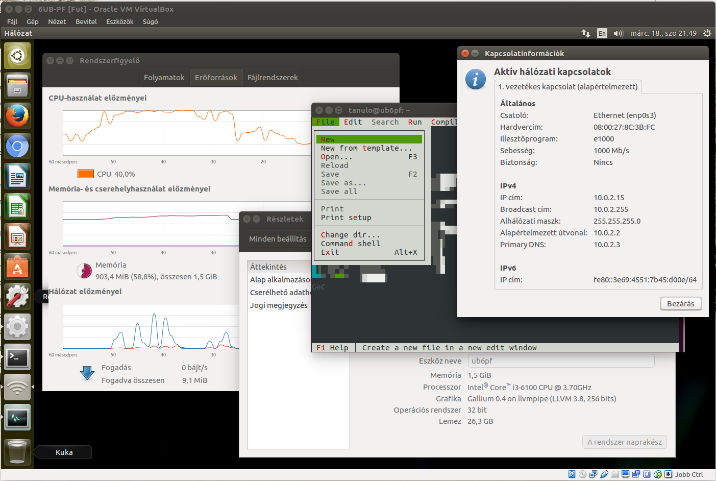 A számítógép neve ub6<monogram> legyen. A telepítő ablakában megjelenő információkat olvassa el. Indítsa el a System Monitor / Resurces (Rendszerfigyelő/Erőforrások). Figyelje meg a hálózat sebességét telepítés közben.