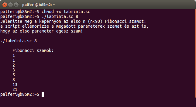 #!/bin/bash # letorli kepernyot clear echo "Jelenitse meg a kepernyon az elso n (n<90) Fibonacci szamot!" echo "a script ellenorizze a megadott parameterek szamat és azt is," echo "hogy az elso parameter egesz szam!" echo # megjeleniti a program nevet es az elso parametert echo $0 $1; echo # ellenorizi, hogy a parameterek szama egy: if test $# -eq 1 # ha igen: then # ellenorzi, hogy az elso parameter szam # a szuro csak azokat a karaktereket engedi at # amlyek 0-9 et tartalmaznak, # az a erteke vagy szam lesz, vagy ures a=`echo $1 | grep '^[0-9]*$'` # # megjelenk az a a kepernyon (ha nincs #) # echo "a= $a" # # ellenorzi, hogy a szam-e # ha az elso ES masodik parametert kellene ellenorizni, akkor: # if test -n "$a" -a -n "$b" # tehat: ha az "a" ES a "b" IS szam if test -n "$a" # ha igen: then # ellenorizi, hogy az elso parameter kissebb mint 90 if test $1 -le 90 then # itt jon maga a program # Az elso ket szam 1 es 1 f1=1 f2=1 echo " Fibonacci szamok:" echo " $f1" echo " $f2" # aztan: # ciklus KEZDETE # Az i valtozni fog 3-tol addig a szamig amit maegadtunk parameterkent: for i in `seq 3 $1` do # minden ujabb szam az elozo ketto osszege: fibo=`expr $f1 '+' $f2` echo " $fibo" # az uj f1 a regi f2 lesz f1=$f2 # az uj f2 pedig a kiszmolt osszeg f2=$fibo done # a ciklus VEGE else echo "Nem megfelelo parameter n > 90 !" fi else echo "Nem szam az elso parameter" fi else echo "a parameterek szama nem egy, hanem $# !!!" fi