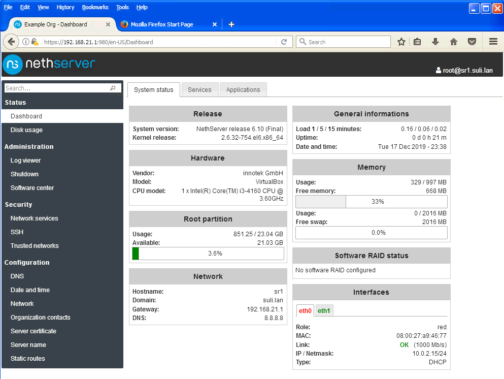 Nyissa meg a Dashboard ablakot. Ellenőrizze az eth0 és az eth1 eszközök IP címeit (Interfaces eth0, eth1). A VirtualBox ablakáról (ne csak a böngészőről mint az alábbi képen) készítsen képet és illessze be a dokumentumba (az eth0 csatoló tulajdonságai láthatóak legyenek).