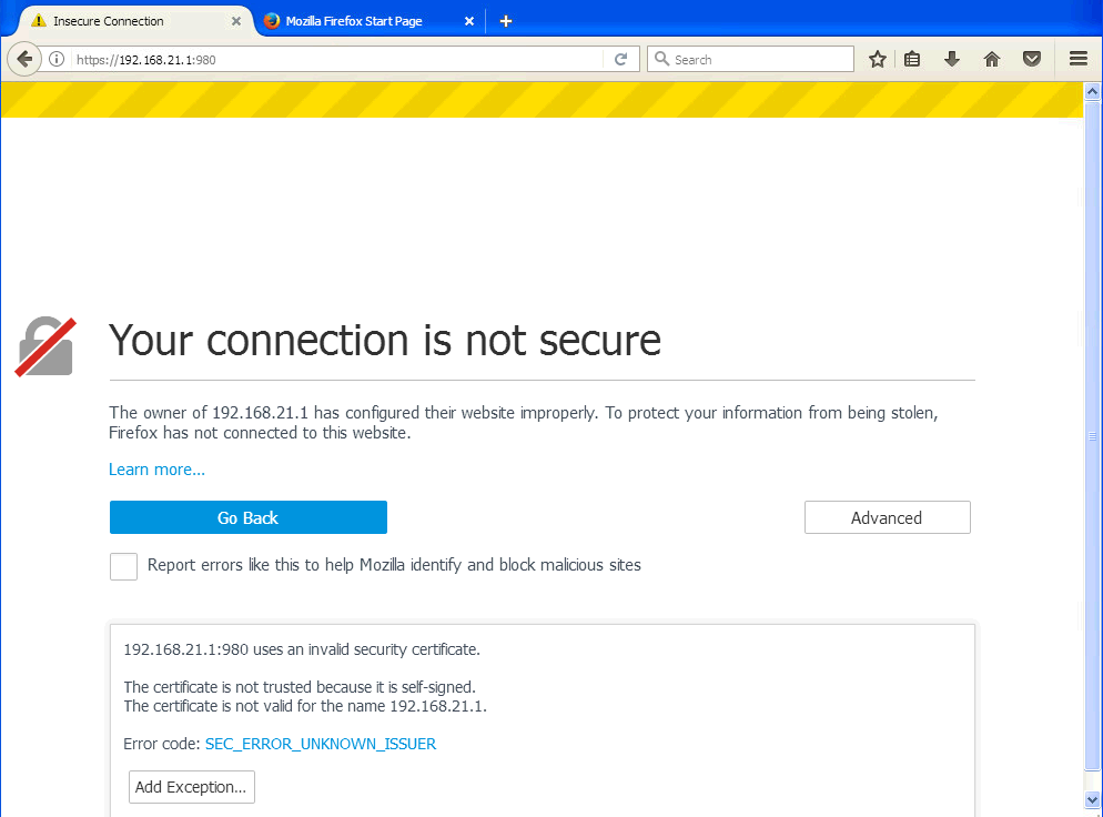 Az XP1-n elindított Firefox böngészőben nyissa meg a következő címet: https://192.168.21.1:980/