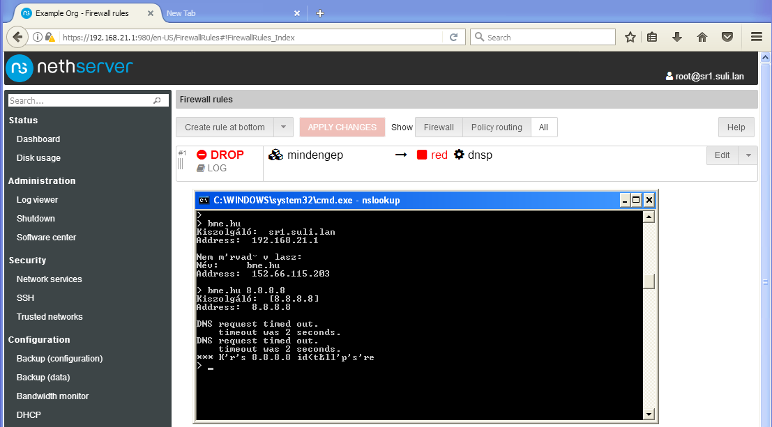 Ellenőrizze ismét a DNS működését először az alapértelmezett DNS kiszolgáló (vagyis a NethServer) majd egy távoli DNS lekérdezésével