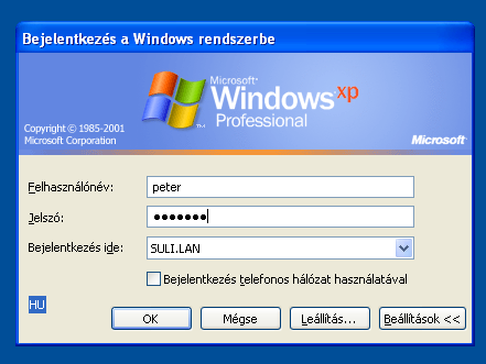Indítsa újra az XP-t és jelentkezzen be peter felhasználóként a SULI.LAN tartományba. A VirtualBox-ban ctrl+alt+del billentyűkombinációt jobbCtrl + Del billentyűvel adja ki.