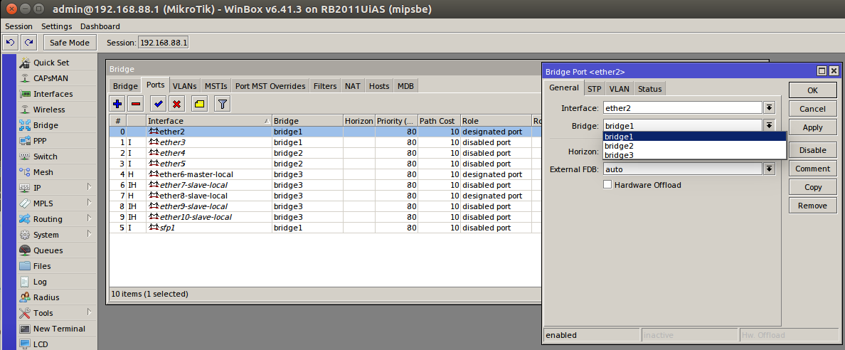 Módosítsa a portok beállításait (Bridge / Ports) az alábbiak szerint: