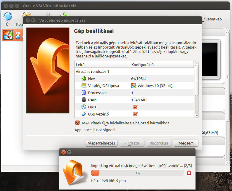 Importálja az átmásolt fájlt a VirtualBox programba. Kapcsolja be a MAC címek újrainicializálását a hálózati kártyához kapcsolót.