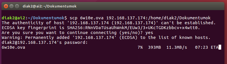 cd Dokumentumok scp 6w10e.ova 192.168.3.97:/home/diak2/Dokumentumok